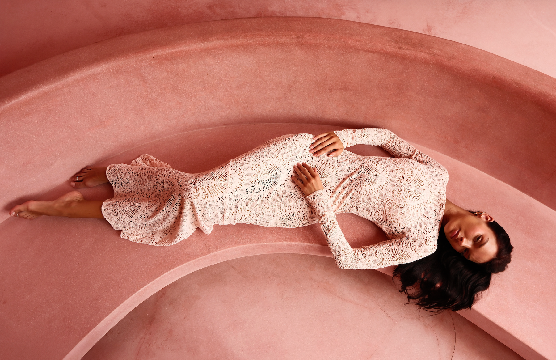 Intricately crafted from delicate lace, the IsabellA Dress embodies timeless elegance with a sculpted, feminine silhouette. Designed with a high boat neckline that beautifully frames the shoulders, it offers full-length sleeves and a body-skimming fit that flows into a graceful flared hem. The open back adds a striking, modern contrast, secured with a delicate tie for an adjustable fit. This piece is refined, sophisticated, and effortlessly alluring.