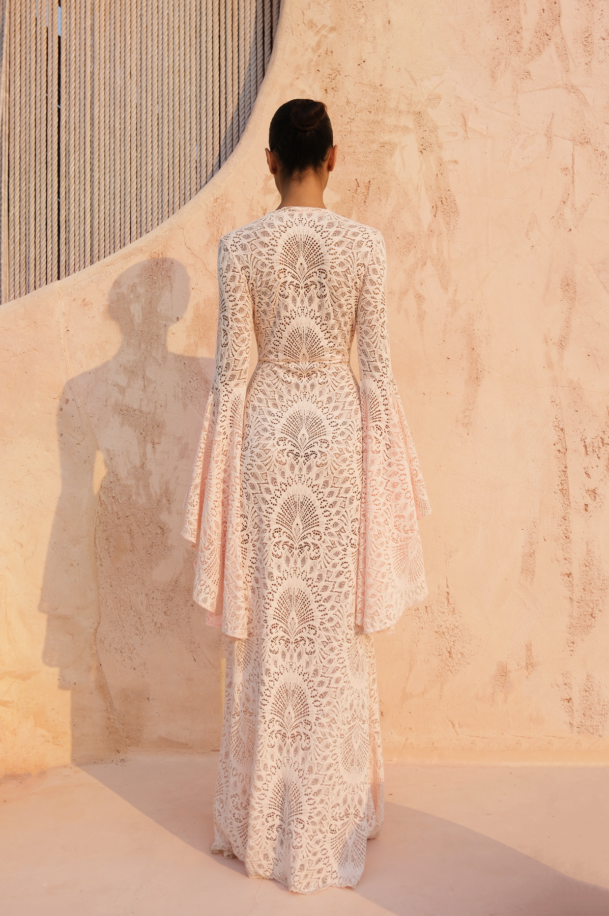 A striking, feminine silhouette, the Amara Dress is crafted from delicate lace that drapes elegantly over the body. Designed with a deep V neckline and long flared sleeves, it features a high side slit and a flowing, floor-length shape that moves beautifully with every step, creating an effortlessly refined statement.