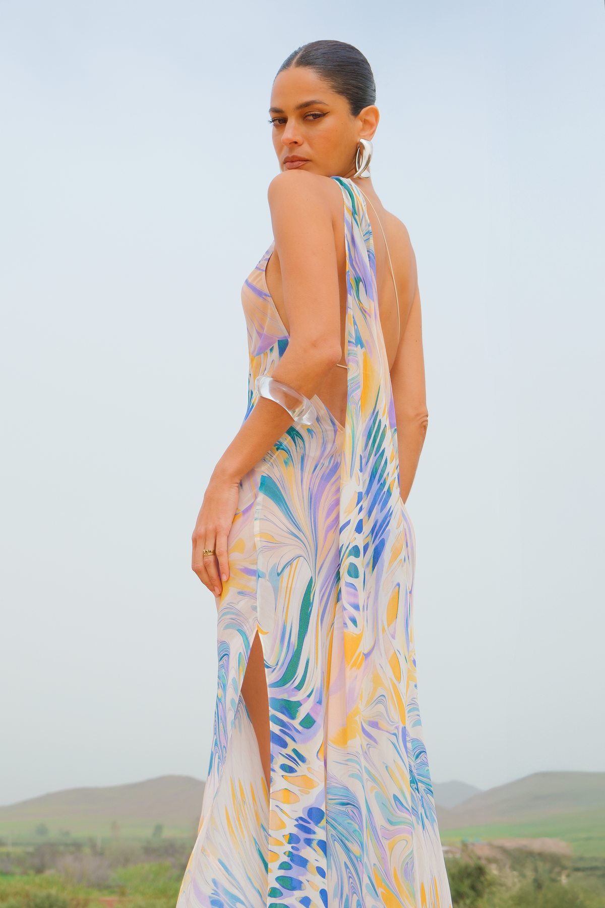 A fluid, elegant silhouette, the Ava Dress is crafted from airy, lightweight viscose that drapes beautifully over the body. Designed with a halterneck neckline and a striking open back, it falls into a flowing, floor-length silhouette that moves effortlessly with every step, creating a refined yet modern statement.