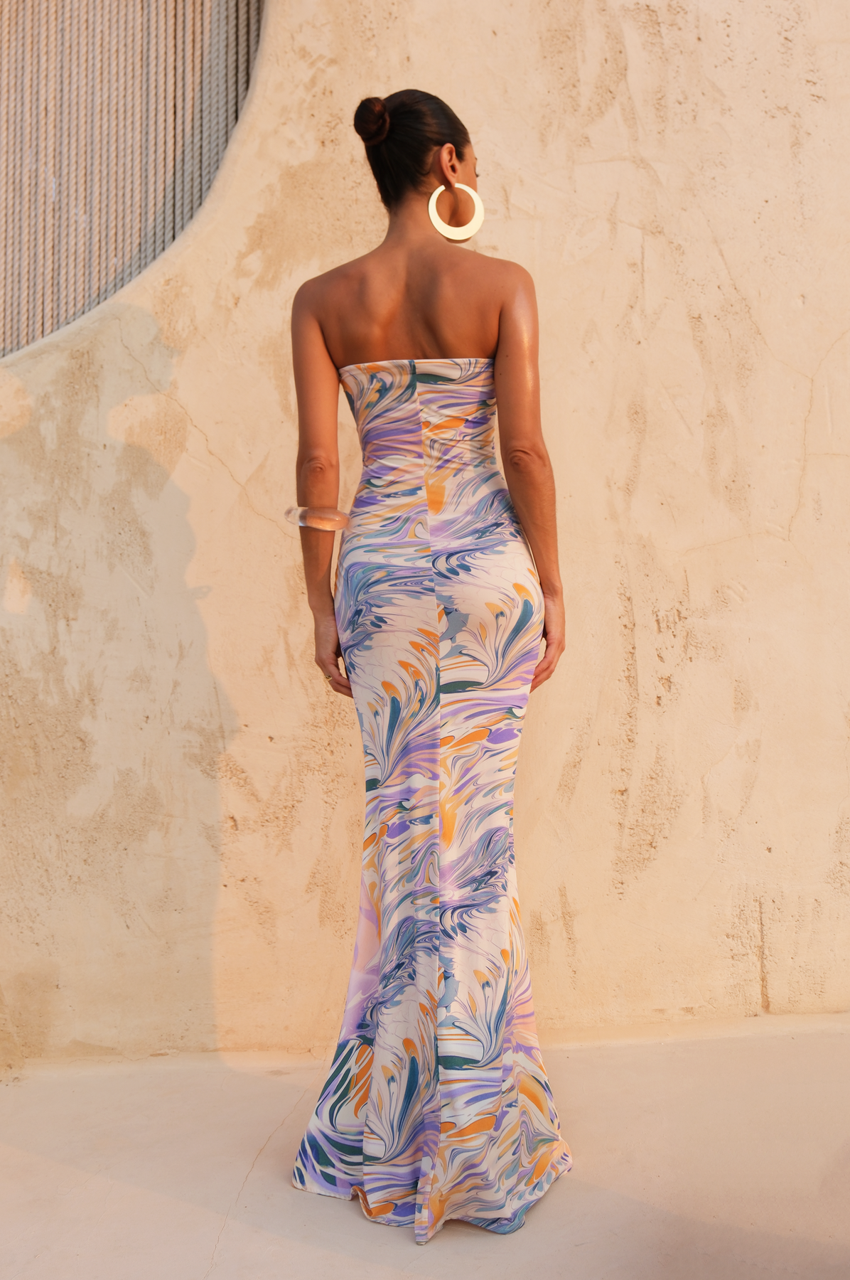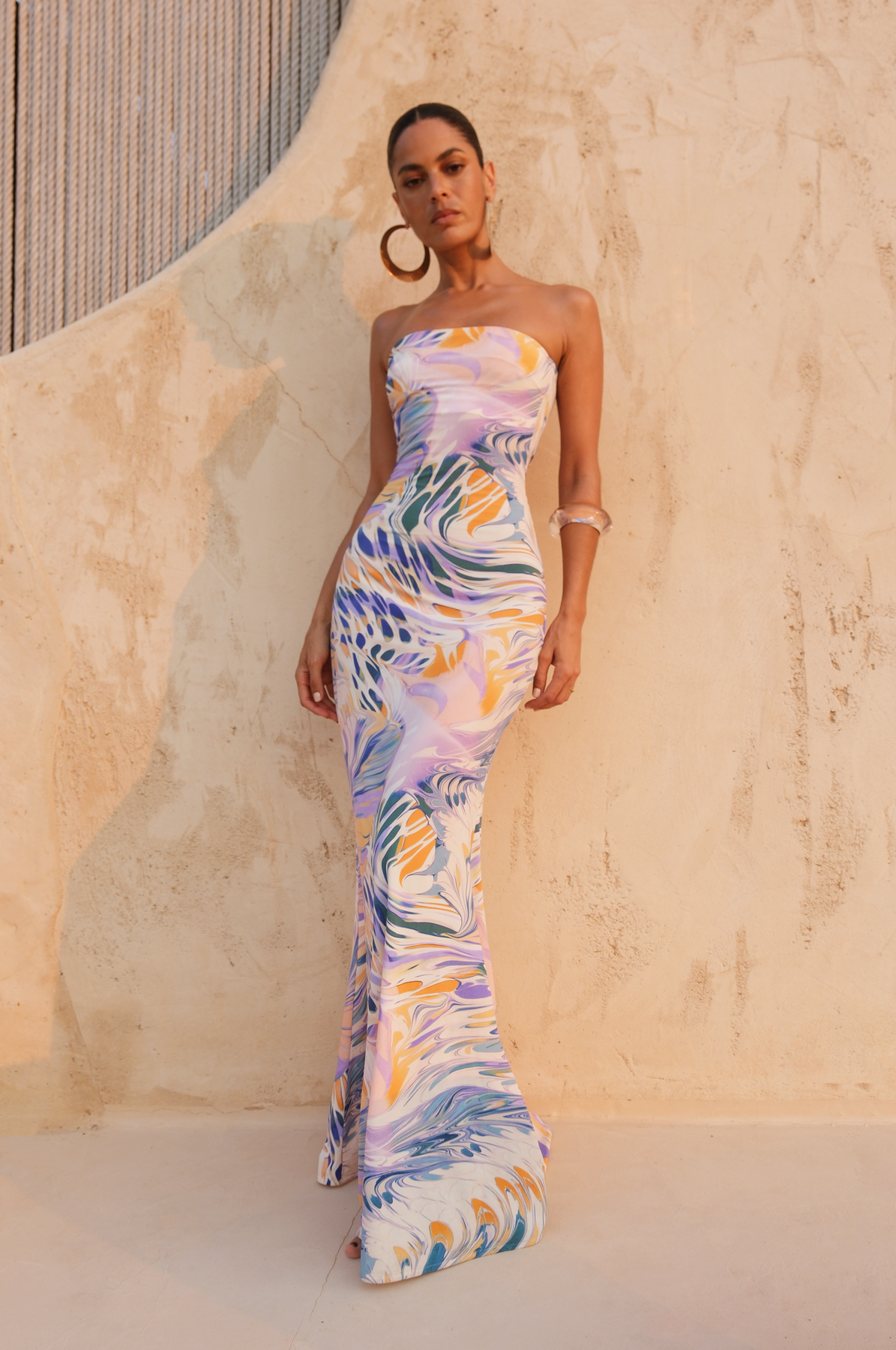 The Elodie Dress is a sleek, strapless silhouette designed to sculpt and elongate the body. Cut in a streamlined, figure-enhancing shape, it hugs the curves before falling into a fluid, floor-length finish.